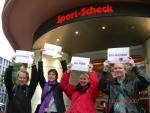 Nach einer erfolgreichen Solidaritätsaktion bei Zara am heutigen Vormittag haben Aktive der ver.di Jugend in Hannover einem weiteren Unternehmen der Otto- Group, SportScheck, am Nachmittag einen Besuch abgestattet. Nach kurzer Rücksprache mit dem Betriebsrat wurden vor den beiden Eingängen der hannoverschen SportScheck- Filiale an KundInnen und PassantInnen Flugblätter verteilt.